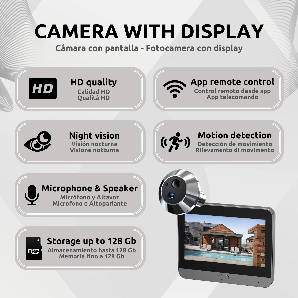 La Cámara Espía Mirilla Wifi Con Pantalla transforma tu puerta en un sistema de vigilancia avanzado y discreto. Equipada con una pantalla LCD de 4.3 pulgadas en alta definición y una cámara de 3 MP con ángulo de visión de 140°, permite observar con total claridad quién está frente a tu puerta.