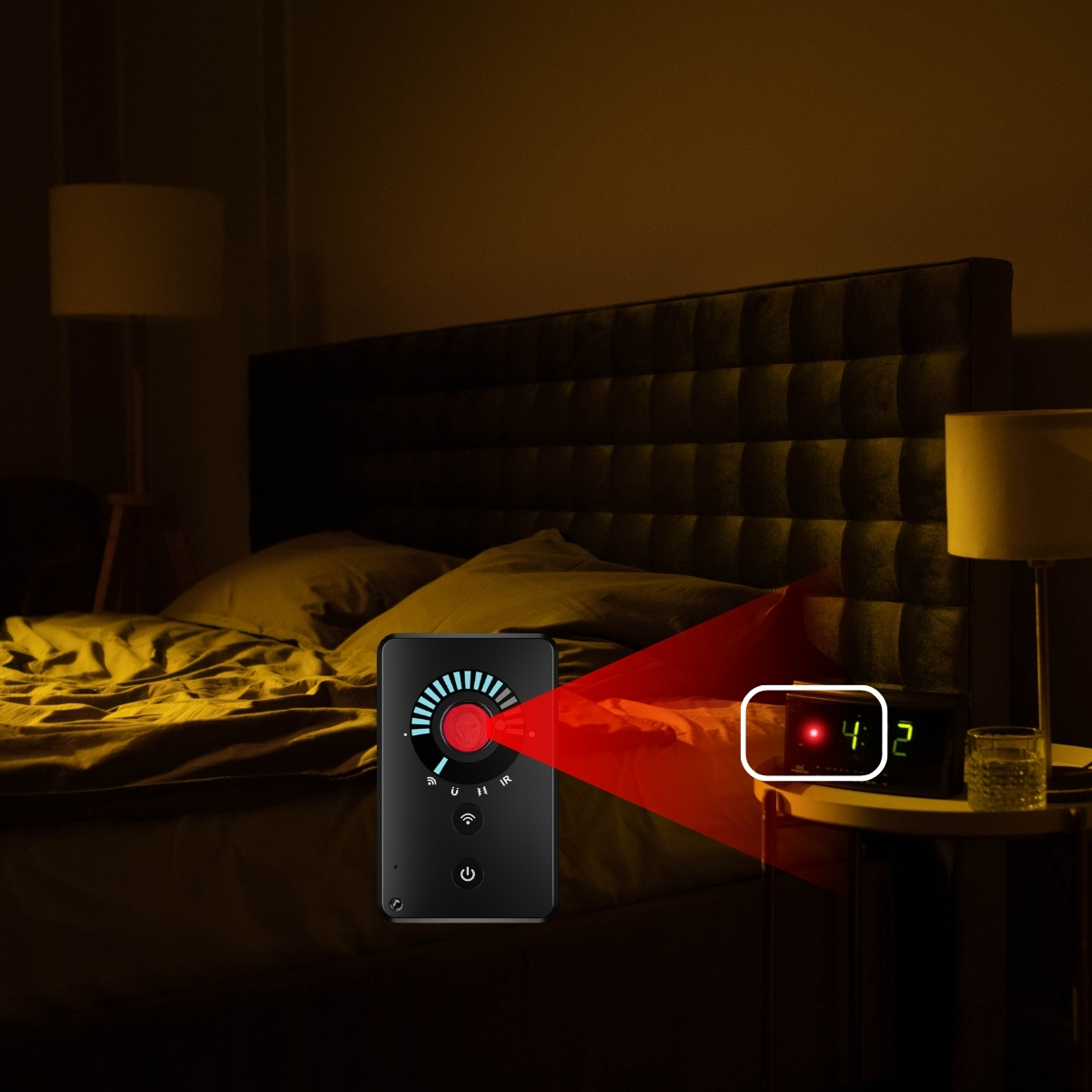 Este dispositivo combina distintos métodos de detección para ofrecer una protección completa de la privacidad. Incorpora un sistema de inspección óptica para localizar lentes de cámaras ocultas, así como detección de señales inalámbricas habituales en dispositivos espía. Además, dispone de un modo silencioso por vibración, especialmente útil en espacios donde se requiere máxima discreción. Los niveles de sensibilidad ajustables permiten adaptar la detección al entorno y localizar dispositivos ocultos incluso tras materiales ligeros.