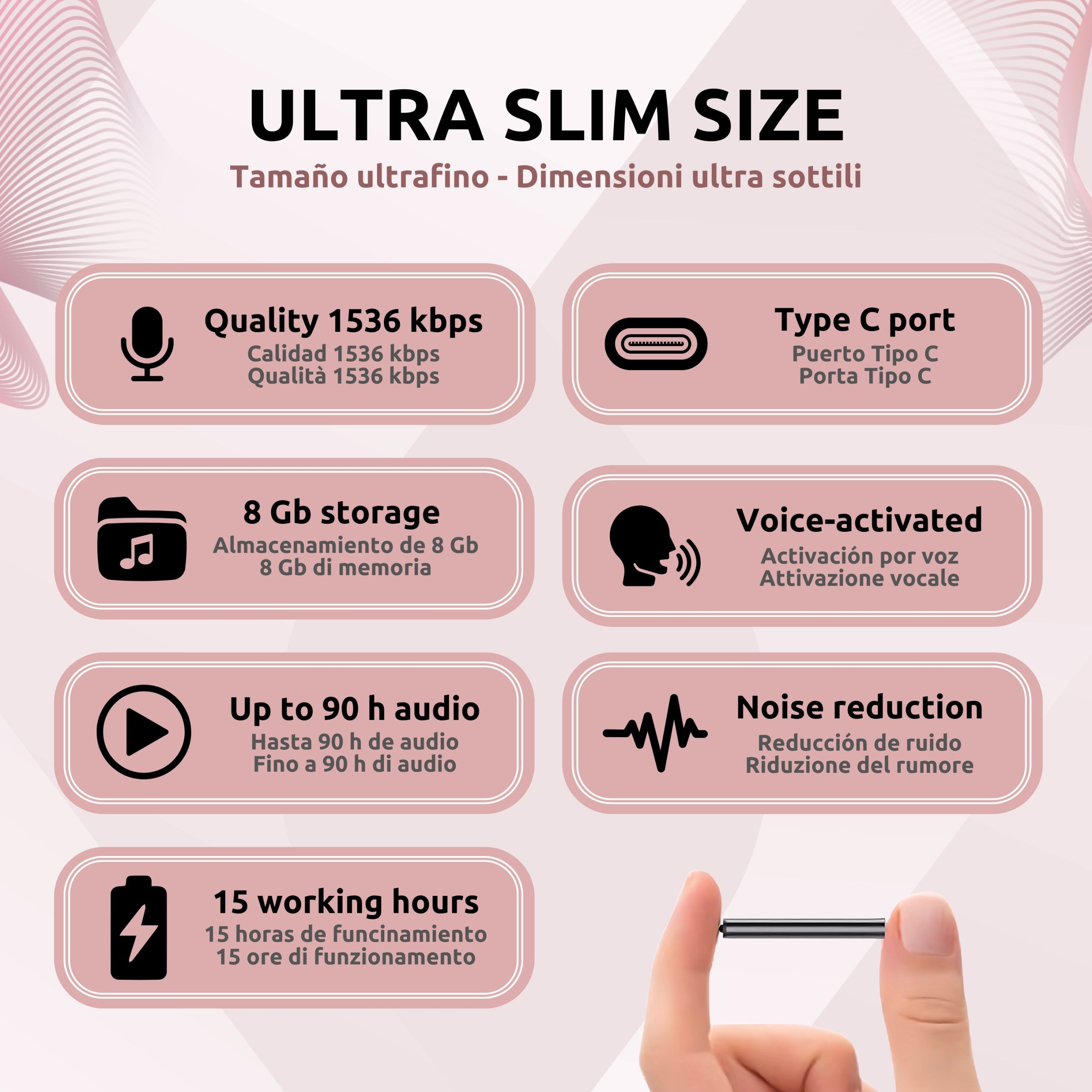 La Grabadora Espía Ultrafina es un dispositivo compacto, eficiente y discreto, diseñado para quienes buscan grabar audio de alta calidad en un formato pequeño y práctico. Con un tamaño de 4,5 x 2 x 0,5 cm, esta grabadora cabe fácilmente en cualquier bolsillo o bolso, lo que la convierte en la opción perfecta para grabaciones discretas y en movimiento. Equipado con 8GB de memoria integrada, permite grabar hasta 90 horas de audio con una calidad de 192 Kbps, con capacidad para aumentar la calidad hasta 1536 kbps.
