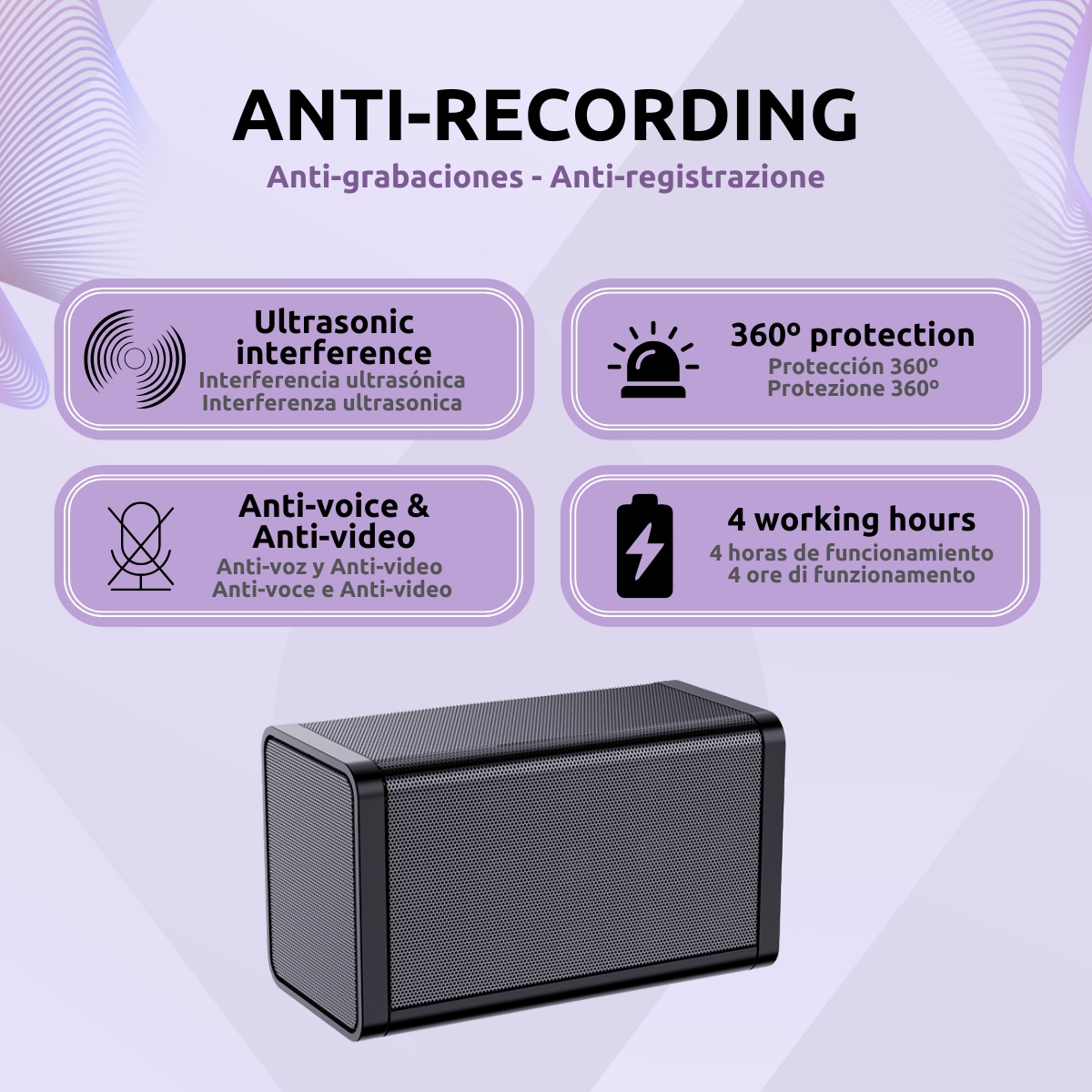 Inhibidor ultrasónico portátil con 360º de cobertura para bloquear grabaciones, protegiendo tu privacidad en reuniones y conversaciones. Anula grabaciones con presión sonora de 90 dB.