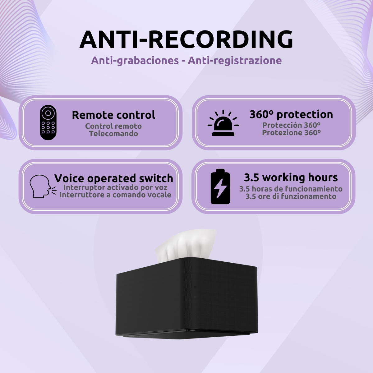 Gracias a su tecnología de interferencia ultrasónica no audible para el oído humano, garantiza que las conversaciones no puedan ser grabadas con claridad, manteniendo la confidencialidad incluso frente a equipos espía avanzados.