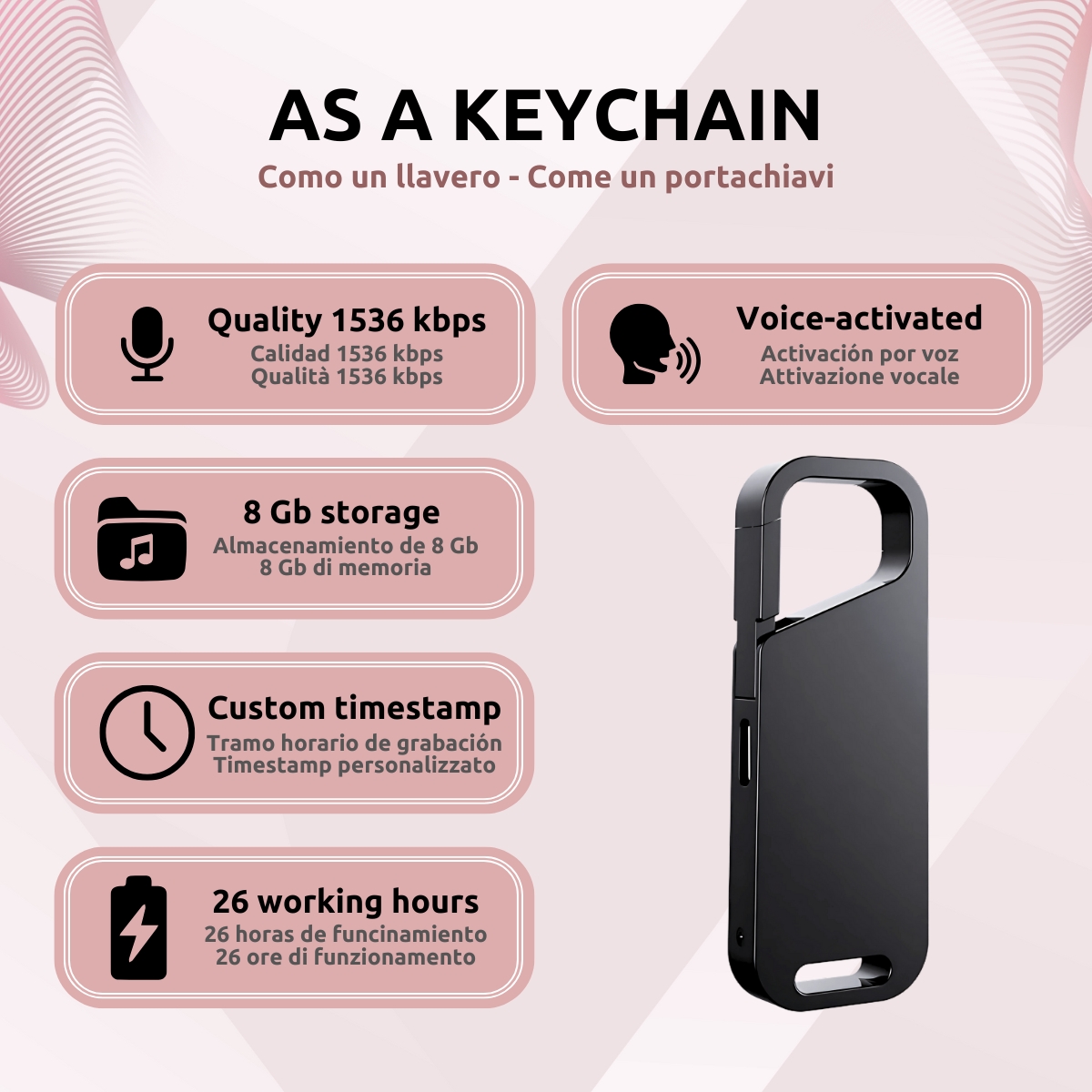 El Llavero Grabadora combina discreción y funcionalidad en un diseño compacto y elegante. Fabricado en aleación de zinc y con un tamaño reducido de tan solo 76 x 28 x 8,7 mm, este dispositivo pasa desapercibido como un llavero común, pero integra una grabadora de voz de alta calidad con múltiples funciones avanzadas.
