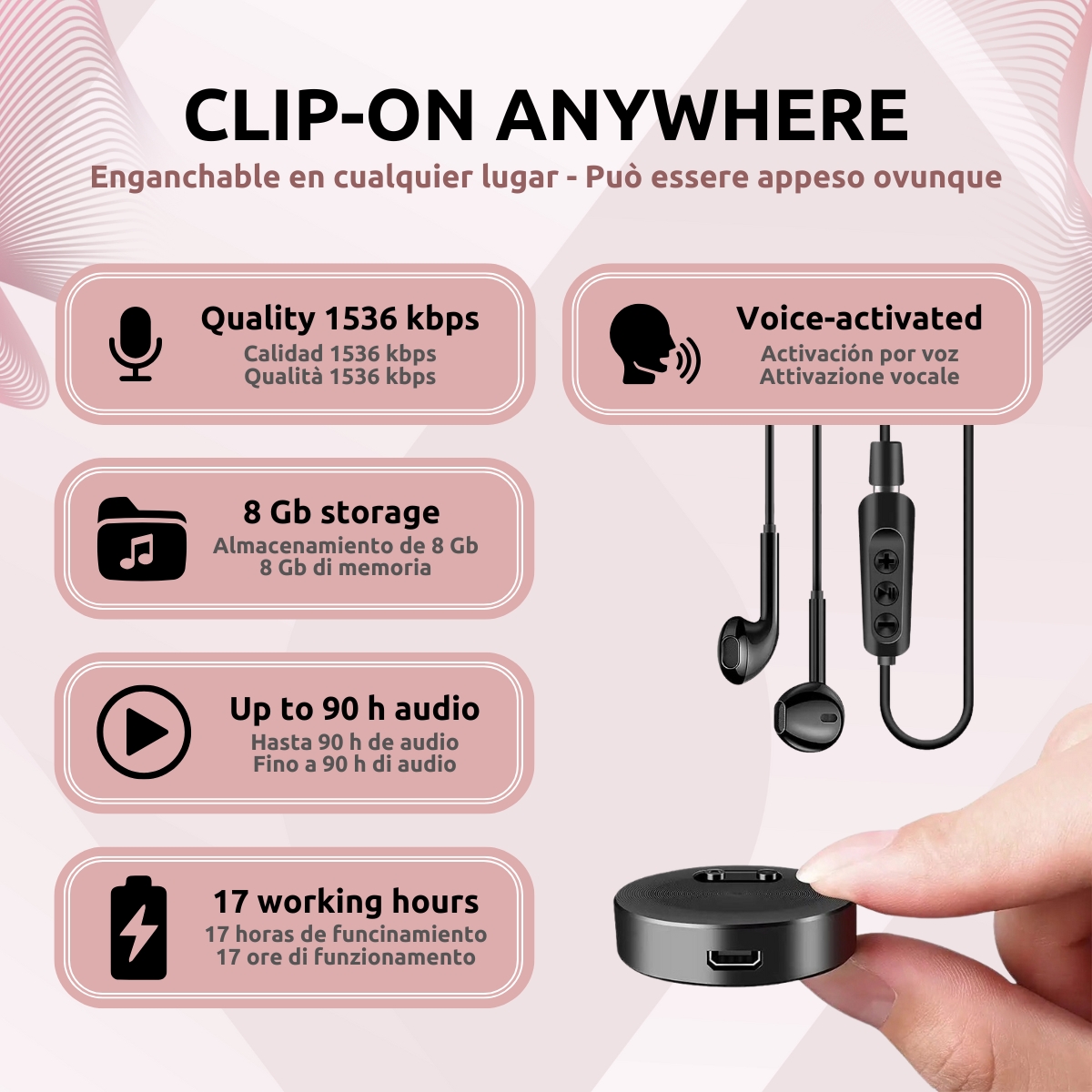 Con una autonomía de hasta 17 horas de grabación continua y 30 días en modo de espera, este micrófono espía es ideal para uso prolongado sin necesidad de recargar constantemente. Dispone de 8GB de memoria interna, con capacidad para grabar hasta 90 horas de audio, que se almacena con marca de tiempo automática, nombrando los archivos según la hora de la grabación. Además, cuenta con grabación segmentada por tiempo y activación por voz opcional a partir de 50 dB, lo que permite grabar solo cuando se detecta sonido.