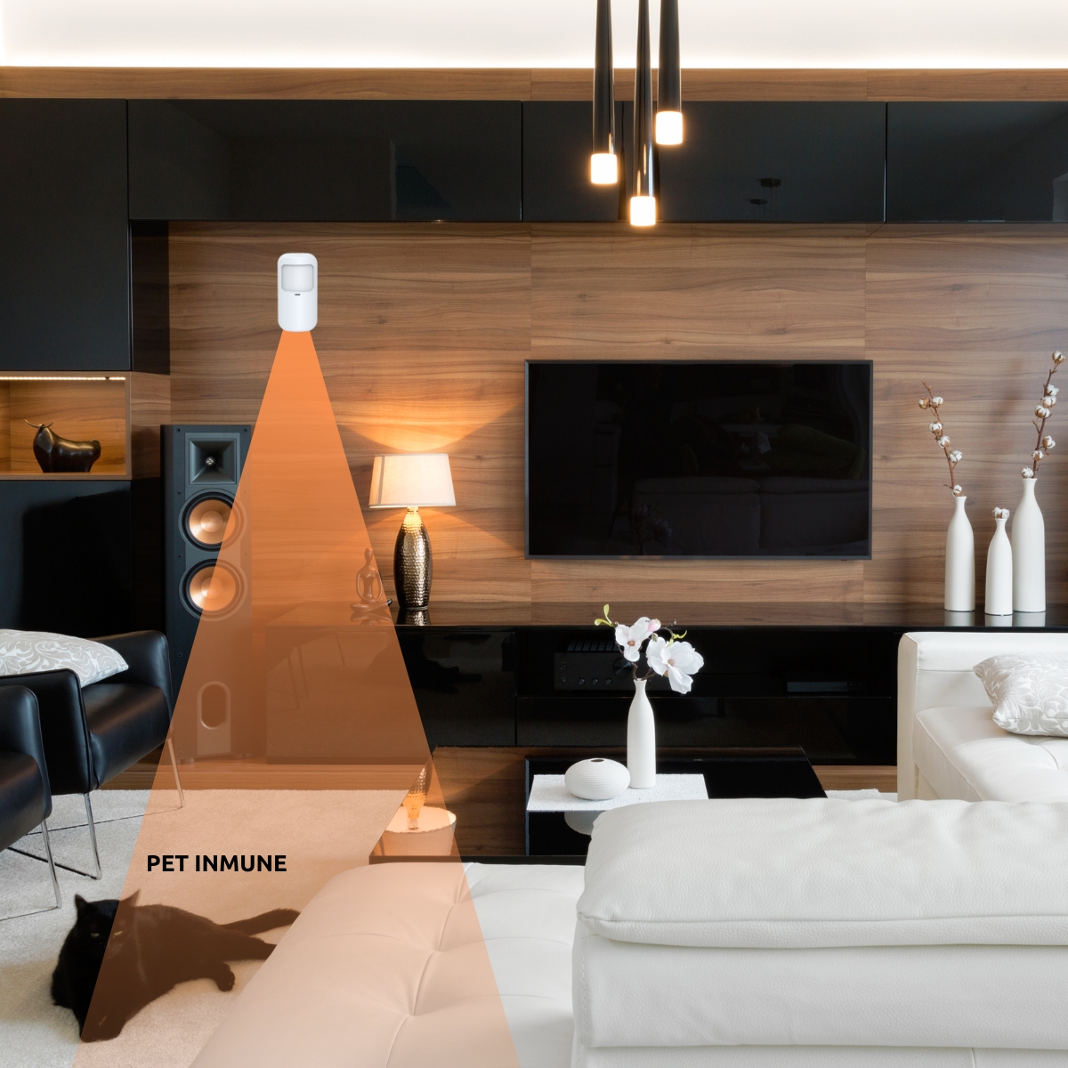 Es un detector pet friendly, capaz de distinguir entre movimientos humanos y de mascotas pequeñas, lo que lo hace ideal para hogares con animales. Funciona de manera inalámbrica en la frecuencia 433 MHz, con un alcance de transmisión de hasta 80 metros en campo abierto.